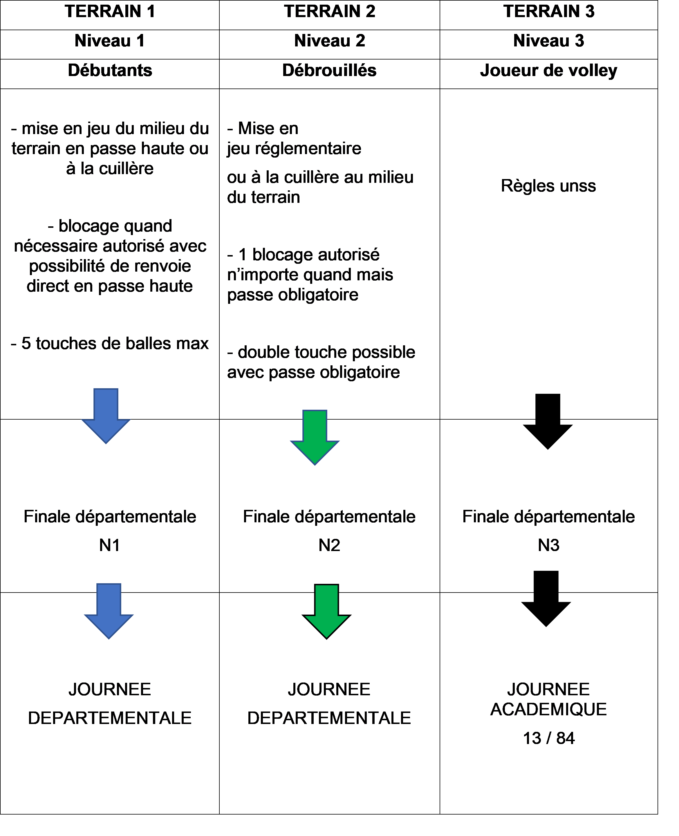 Une qualification (nombre d’équipes) par terrain est envisagée, pour décerner le titre de champion départemental dans chaque niveau, le niveau 3 seul s’ouvrant sur la journée académique