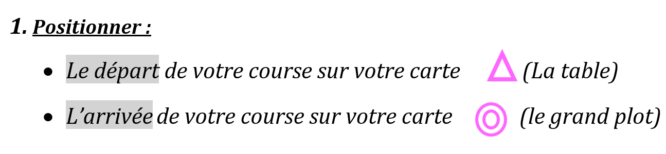Cette première consigne amène les élèves à découvrir les symboles du départ et de l’arrivée, il vous conviendra de les définir pour nous c’est la table de travail et un plot qui ne sont pas pour le moment répertorié dans la légende. c’est un choix pour ne pas tout mélanger