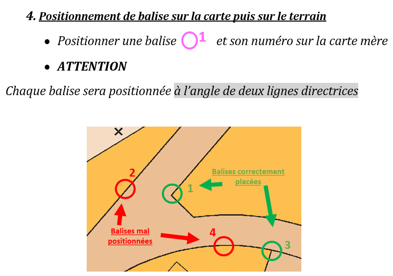 On donne à chaque groupe une balise qu’il n’a pas positionné sur le terrain. Ils doivent positionner la balise, rond et numéro sur une carte et aller poinçonner puis venir vérifier avec le coupon réponse.