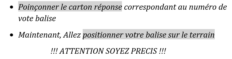 Chaque groupe positionnera plusieurs balises en répétant le protocole indiqué. Ce qui permettra à chaque groupe de travailler à son rythme et privilégier la qualité du travail plutôt que le volume. Tous les groupes ne positionneront pas le même nombre de balises.
