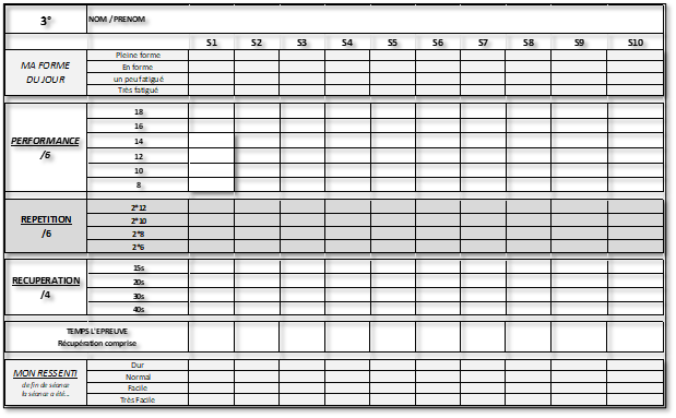 A la fin de l’épreuve (2 séries de X répétitions + temps de repos 3′), chaque élève note le temps total sur sa fiche, ce temps va permettre à l’enseignant de vérifier la bonne réalisation de l’épreuve au regard des contraintes choisies.
